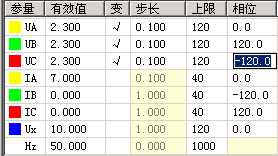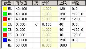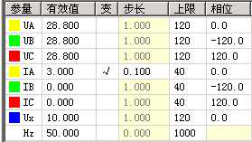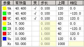 試驗參數設置如下圖所示:由測試儀輸出線電壓70V(單相電壓為40.4V,三相電壓UA、UB、UC的相位分別為0º、-120º、120º ),大于閉鎖電壓60V,保護處于閉鎖狀態。由測試儀輸出相電流,初始值為3A,步長為0.1A,逐步增大相電流值至7A,檢驗保護應不動作。