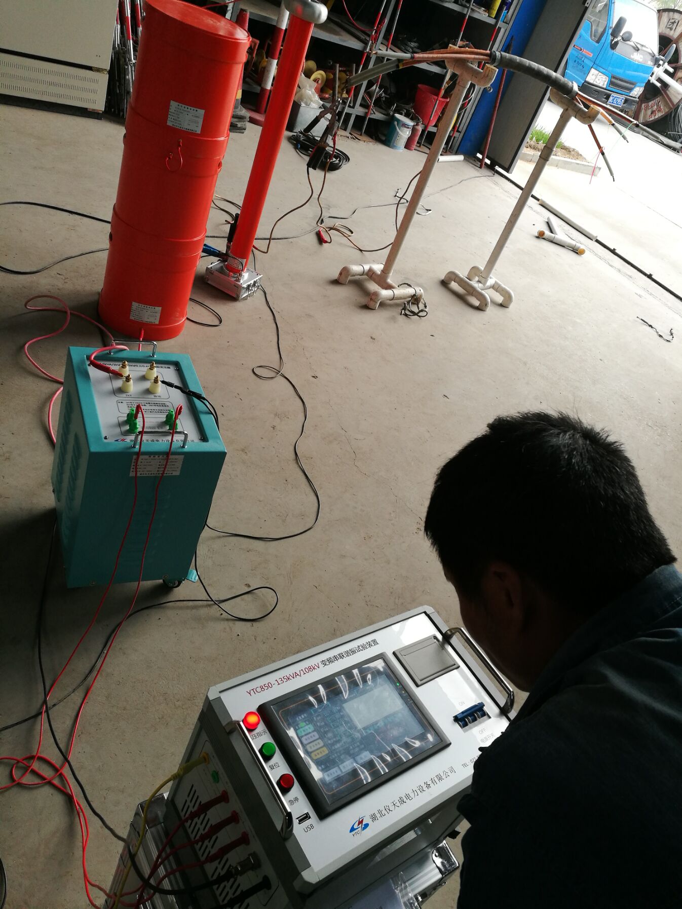 此次培訓(xùn)的設(shè)備和內(nèi)容很多。李工首先對各項設(shè)備的使用,接線方法進(jìn)行了實地操作和詳細(xì)的講解,但此次培訓(xùn)的重點是YTC850-135kVA/108kV變頻串聯(lián)諧振試驗裝置,該設(shè)備具有流、零位啟動、系統(tǒng)失諧(閃絡(luò))等保護(hù)功能,過壓過流保護(hù)值可以根據(jù)用戶需要整定,試品閃絡(luò)時閃絡(luò)保護(hù)動作并能記下閃絡(luò)電壓值,以供試驗分析。整個裝置單件重量很輕,便于現(xiàn)場使用。裝置具有三種工作模式:全自動模式、手動模式、自動調(diào)諧手動升壓模式,方便用戶根據(jù)現(xiàn)場情況靈活選擇,提高試驗速度。