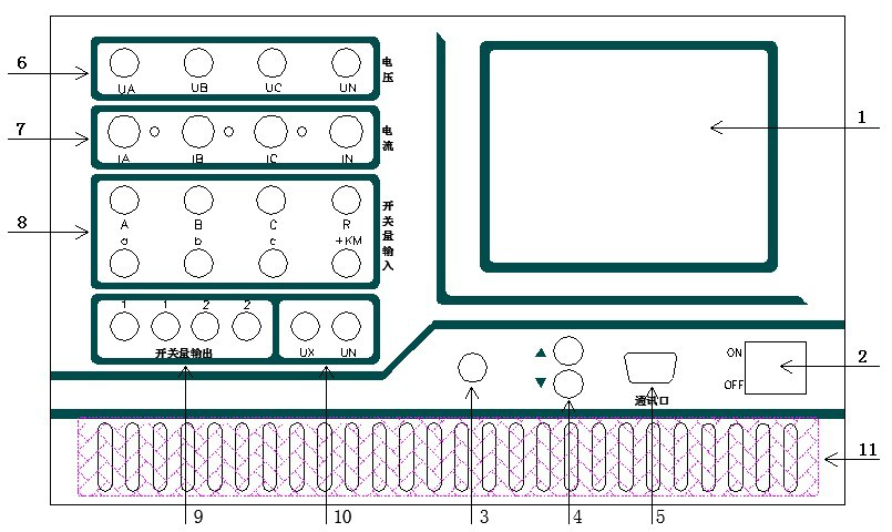7.IA、IB、IC、IN 為電流輸出端子,各電流端子(IA、IB、IC)右側的小信號燈指示該路電流輸出是否存在波形畸變或負載開路