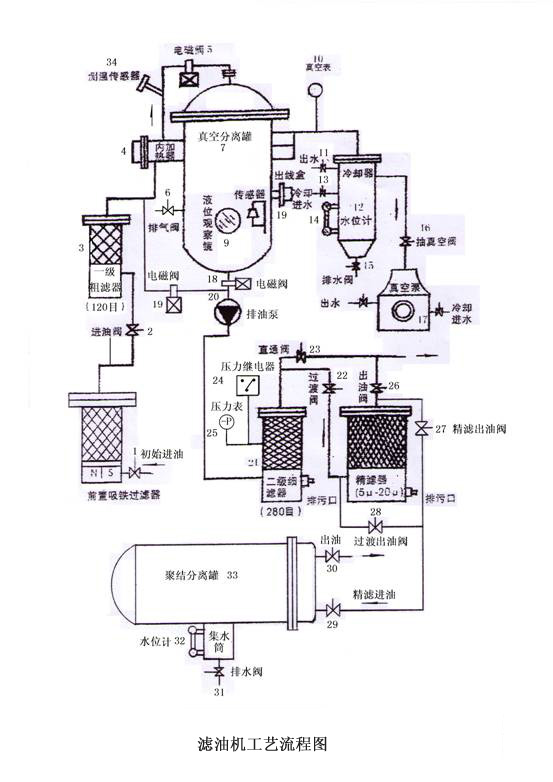 2、當(dāng)油液經(jīng) 數(shù)次 分離過(guò)濾后,從聚結(jié)分離罐(3),集水筒旁水位計(jì)(32)觀察,由排水閥排水,直到油箱內(nèi)被過(guò)濾的油水分排盡為止,對(duì)于要求較高的油可最后采用真空分離法,如下: