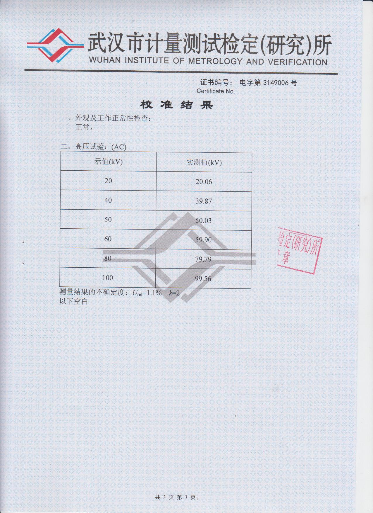 工頻耐壓水平 110kV/1min