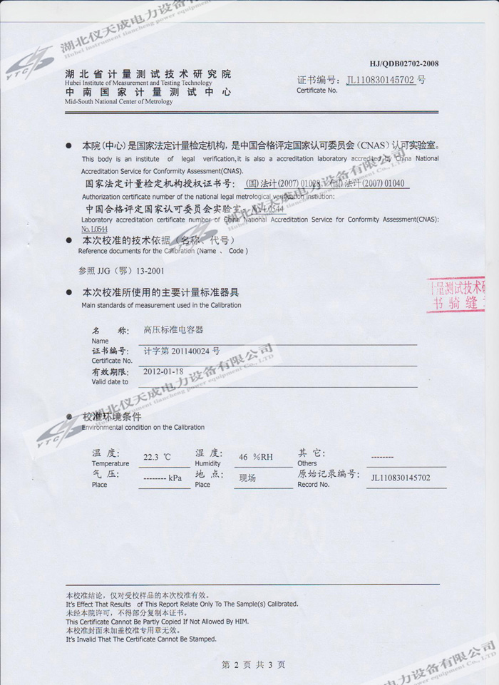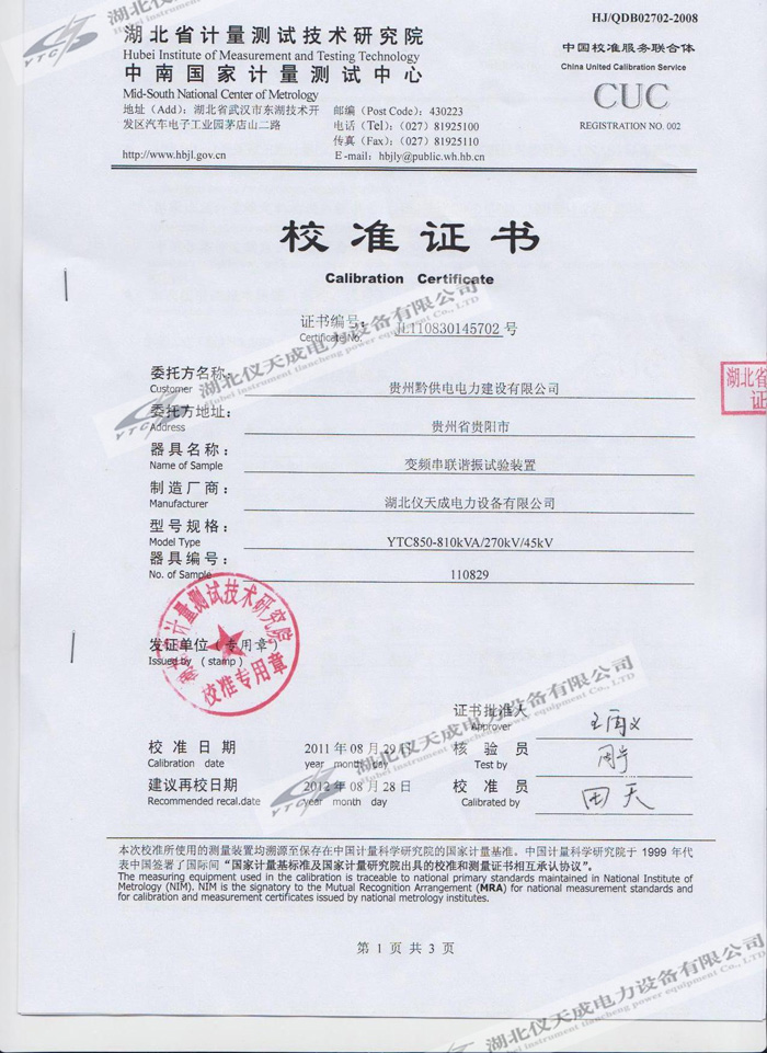 轉(zhuǎn)載:"YTC850-810kVA/270kV/45kV變頻串聯(lián)諧振試驗裝置的資質(zhì)證書" 請注明來源于儀天成電力。 更多技術(shù)問題請致電儀天成電力客戶服務(wù):027-87876585,技術(shù)部專線:027-87876585,在線客服:719388481